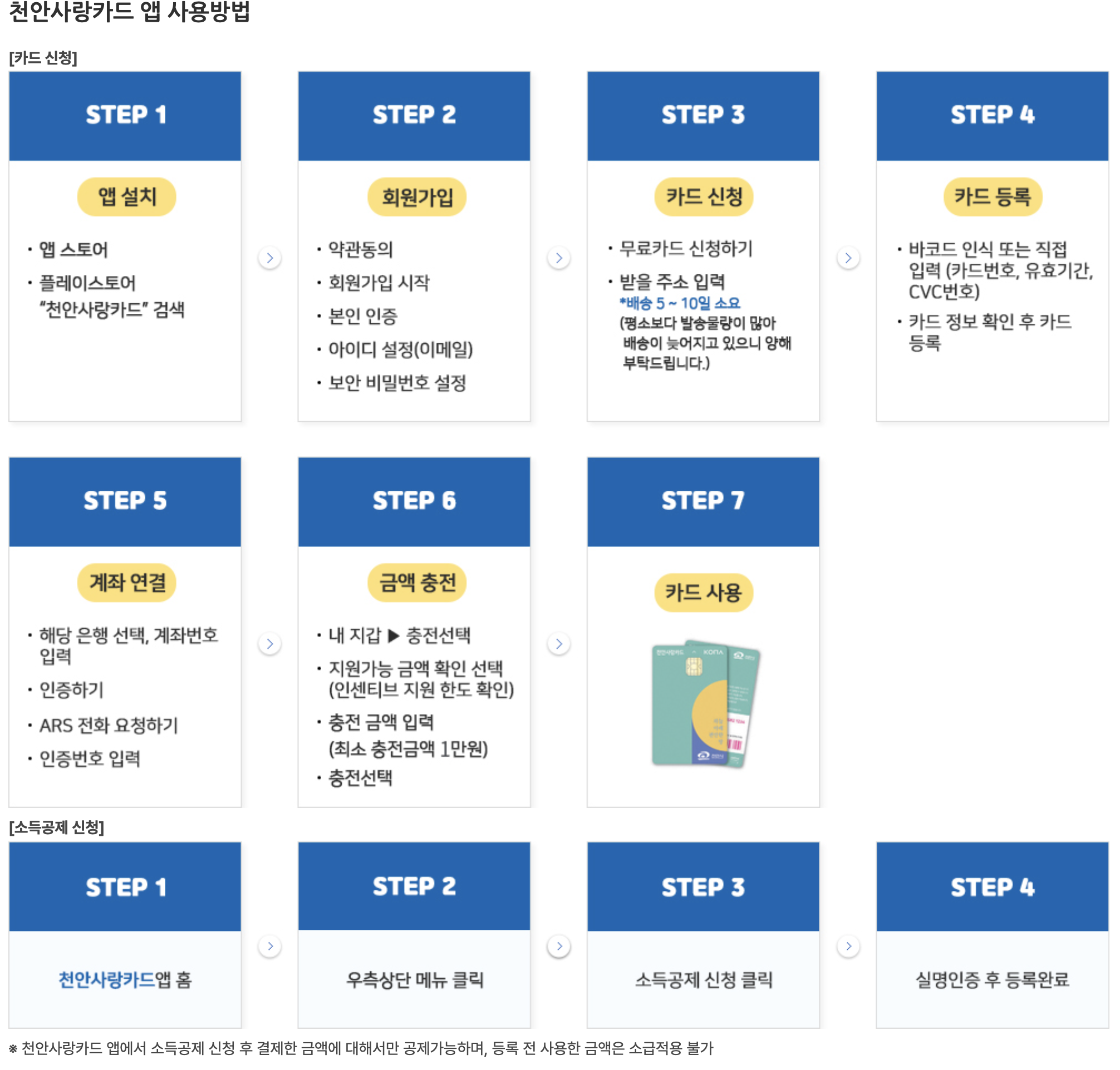 | 모바일 앱 | '천안사랑카드' 앱 설치 → 회원가입 → 카드 신청 → 주소 입력 → 5~10일 내 우편 수령 |